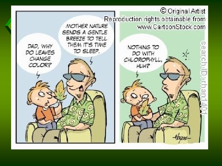 Fall Leaf Colors u. Chlorophyll breaks down. u. N and Mg salvaged and moved into the stem for next year. u. Accessory pigments remain behind, giving the various fall leaf colors.