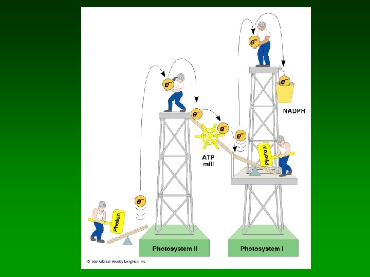 Two photosystems • Photosystem I (PSI) – Contains specialized chlorophyll a molecule known as P 700 (absorbs light best at 700 nm -- far red) • Photosystem II (PSII) – Reaction center molecule is chlorophyll a called P 680 (absorbs light best at 680 nm -- red) • Both chlorophyll a molecules are identical; just associated with different proteins which causes slightly different absorption spectra.