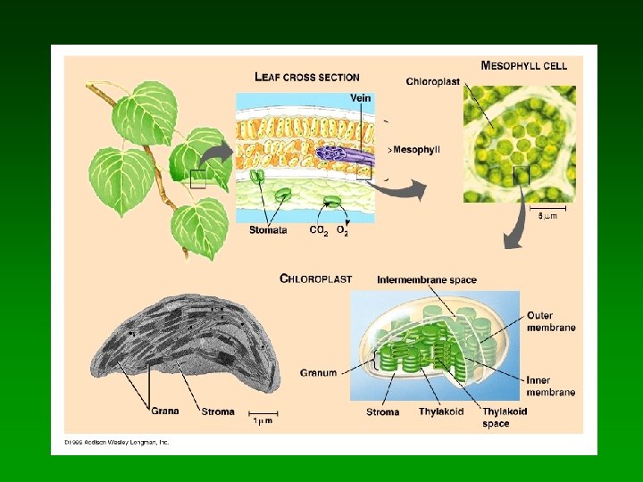 Chloroplasts • Chlorophylls a, b, c, d – Primarily in cells of the leaf mesophyll – Also in bundle sheath cells (larger than normal chloroplasts) • Stomata in lower/upper/both epidermis • Chloroplast anatomy – Three compartments divided by membranes • Intermembrane space • Thylakoid space; thylakoids stacked into grana; chlorophyll located in thylakoid membranes • Stroma: viscous fluid outside thylakoids