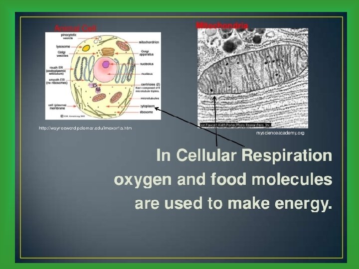 Cellular Respiration • This is the process by which cells use oxygen to produce energy from food. • It can occur at any time. • Once the energy from sunlight is changed into chemical energy by photosynthesis, an organism has to transform the chemical energy into a form that can be used by the organism.