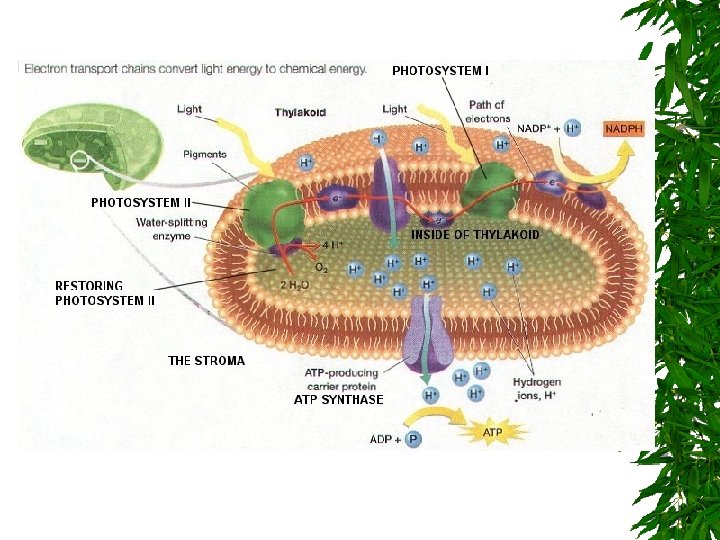 Photosynthesis: Stage One Chloroplasts contain stacks of disk-like structures called thylakoids Light energy hits the thylakoid and the energy is transferred to electrons in chlorophyll; the electrons get “excited” Excited electrons leave chlorophyll and are replaced by electrons in water The water is split by an enzyme and electrons from the hydrogen atom are taken by the chlorophyll. The oxygen atoms from different water molecules combine to make oxygen (O 2)