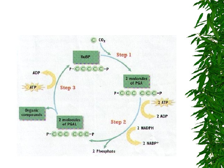 The Calvin Cycle Step one: each carbon dioxide molecule is added to a 5 -carbon compound by an enzyme – this makes a 6 -carbon compound Step two: the 6 -carbon compound splits into two 3 -carbon compounds. Then, phosphate groups from ATP and electrons from NADPH are added to turn the 3 -carbon compounds into 3 -carbon sugars