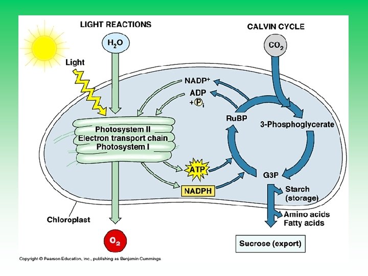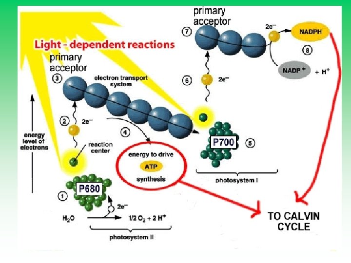 Light Dependent Reactions • When sunlight strikes the chlorophyll molecules of the thylakoid membrane, the energy in the light is transferred to electrons.