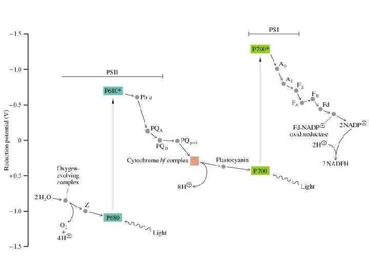 The Z Scheme • An arrangement of the electron carriers as a chain according to their standard reduction potentials • PQ = plastoquinone • PC = plastocyanin • "F"s = ferredoxins • Ao = a special chlorophyll a • A 1 = a special PSI quinone • Cytochrome b 6/cytochrome f complex is a proton pump