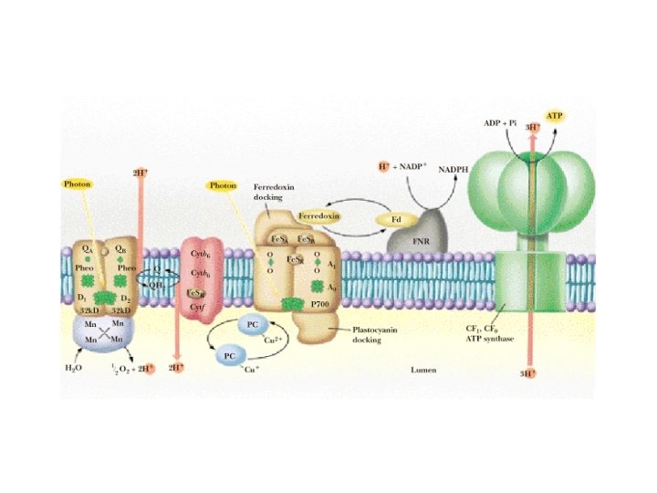 Transfer of e- from PQH 2 to Cytbf Complex (another Q-cycle) • Electrons must be transferred one at a time to Fe-S group. • Another Q-cycle • First PQH 2 transfers one electron to Fe-S group, a PQformed. 2 H+ pumped into lumen • A second PQH 2 transfers one electron to Fe-S group and the one to reduce the first PQ- to PQH 2. 2 more H+ pumped into lumen • 4 protons pumped per PQH 2. Since 2 PQH 2 produced per O 2 evolved 8 protons pumped