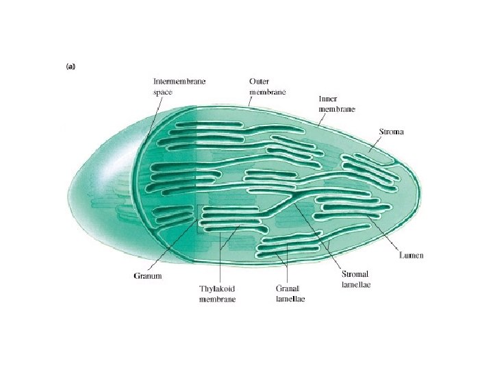 Chloroplast • Inner and outer membrane = similar to mitochondria, but no ETC in inner membrane. • Thylakoids = internal membrane system. Organized into stromal and granal lammellae. • Thylakoid membrane - contains photosynthetic ETC • Thylakoid Lumen – aqueous interior of thylkoid. Protons are pumped into the lumen for ATP synthesis • Stroma – “cytoplasm” of chloroplast. Contains carbon fixation machinery. • Chloroplasts possess DNA, RNA and ribosomes
