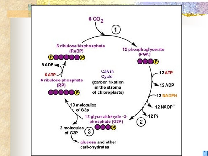 The Calvin Cycle con’t n n n (TCA) Carbon dioxide fixation. The NADPH and ATP from the light reaction provide the energy for producing glucose from carbon dioxide. This takes place in the stroma of the chloroplast. a. 6 molecules of CO 2 enter the cycle. Rubisco, an enzyme, is responsible for fixing CO 2 to an existing molecule. b. 6 molecules of Ribulose phosphate (5 -C each) affix 6 CO 2 to make 12 phosphoglycerates (PGA) (3 -C each) c. ATP and NADPH are used to convert these to 12 phosphoglyceraldehydes (PGAL) (3 -C each) d. 2 PGAL are removed to make glucose, while 10 return to remake 5 Ribulose phosphates (5 -C each).
