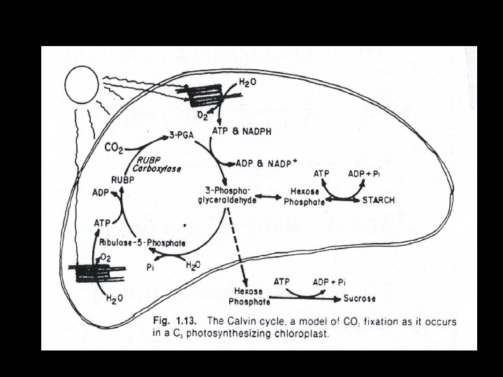 The overall chemical reaction • CO 2 + 2 H 2 O light / atenna ADP +Pi +NADP+ CO 2 (CH 2 O) + H 2 O + O 2 PSII PSI Cytochrome enzymes/ stroma Ru. BPcarboxylase : CO 2 receptor O 2 + H+ +Pi ATP + NADPH (CH 2 O)