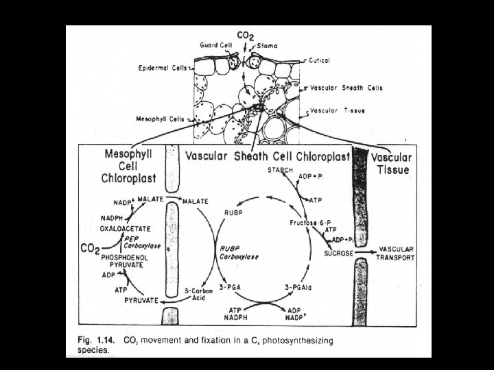 Carbondioxide fixation Biomass or Dry weight = Photosynthesis Respiration - Dead - Translocation Carbon Balance • C 3 species : Calvin cycle ; RUBP 3 -PGA • C 4 species : Hatch & Slack cycle ; PEP Oxaloacetic Acid etc. • Crussulation Acid Metabolism (CAM) : CO 2 fixed during night C 3 vs C 4 : Kranz anatomy