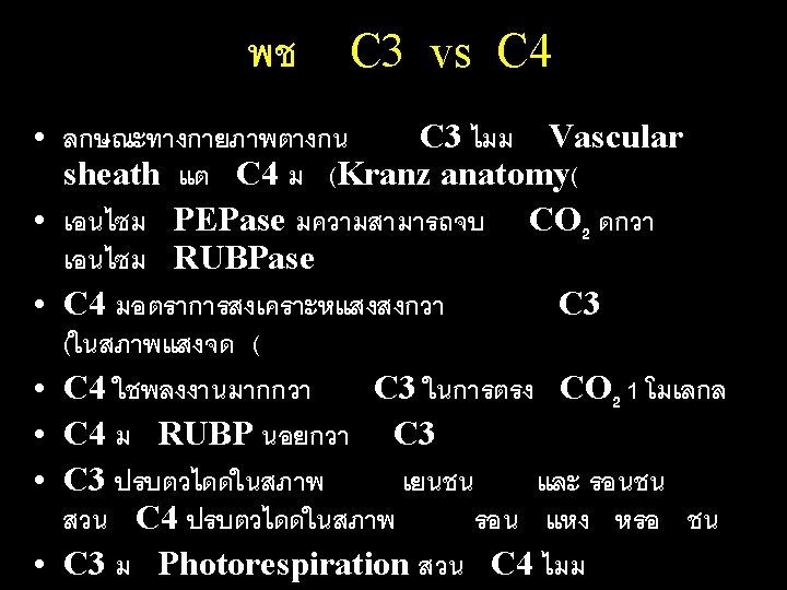 C 3 C 4 and CAM plant PEP Carboxylase CO 2 C 4 Organic acids PEP C 3 C 4 CAM Ru. BP Carboxylase CO 2 C 3 acids CO 2 PGA RUBP Mesophyll Bundle sheath Dark Light (CH 2 O)