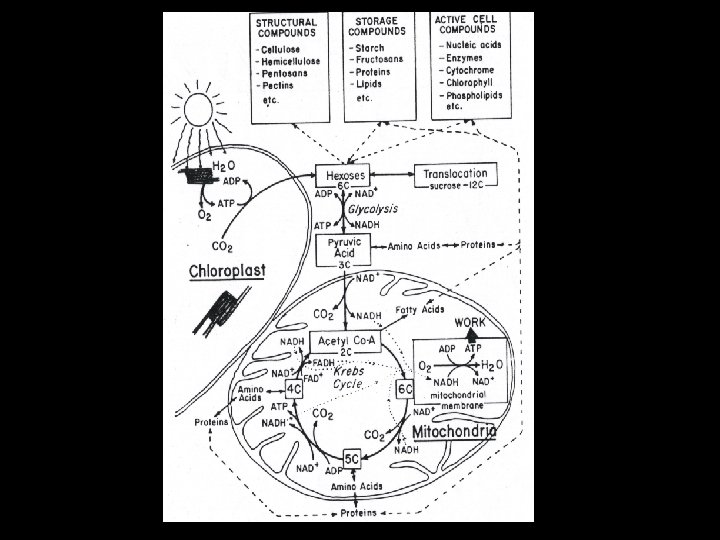 Major plant metabolisms O 2 STRUCTURAL compounds • cellulose • hemicellulose • pentosans • pectin, ect. Chloroplast : Photosynthesis STORAGE compounds • starch • fructosans • proteins • lipids, ect. ACTIVE CELL compounds • nucleic acids • enzymes • cytochrome • chlorophyll • phospholipids, ect. Synthesis / Translocation Glycolysis CO 2 ATP, NADP Mitochondria : Respiration; Krebs cycle O 2 CO 2