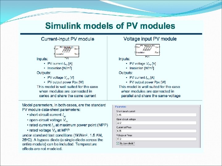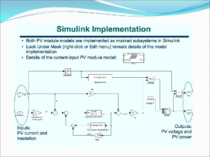 PV Models in Simulink Made models of PVs using resources from the University of Colorado at Boulder Insolation – a measure of solar energy on an area over a given amount of time. Usually in units of W/m^2 Solar Insolation Peoria, IL Jan k. Wh/(m^2 day) W/m^2 Feb March April May June July Aug Sep Oct Nov Dec 3. 271 4. 109 4. 642 4. 921 5. 239 5. 740 5. 880 5. 727 5. 639 4. 562 2. 957 2. 721 136. 292 171. 208 193. 417 205. 042 218. 292 239. 167 245. 000 238. 625 234. 958 190. 083 123. 208 113. 375