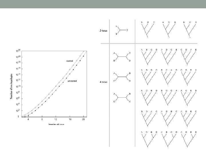 How many possible unrooted trees? 1 2 3 1 G G A 2 G G G 3 A C A 4 A C G 1 3 1 2 1 3 2 4 3 4 4 2 Tree III