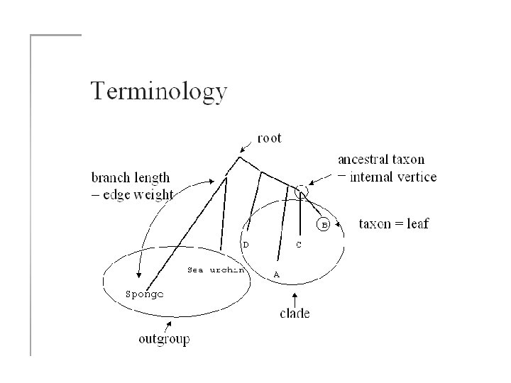 Frequently Used Terms • Clade: A monophyletic taxon. Clades are group of organisms • Taxon: Named group or organisms but not necessarily a clade • Branch Length: In some case it repersent divergence • Node: A bifurcating branch point