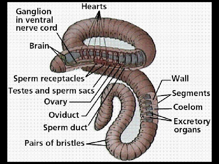 Earthworm Excretion • Excretory organs called nephridia filter excess H 2 O and nitrogenous wastes from the coelomic cavity of one segment • This waste passes through a long tube surrounded by blood vessels (much like our kidneys) and eventually exits through an excretory pore in the next segment • Excess water is reabsorbed into the blood vessels