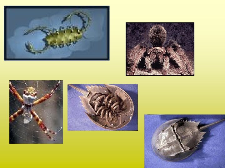 8. Subphylum Chelicerata. A. Examples – spiders, mites, scorpions, horseshoe crabs B. Body is divided into 2 parts: cephalothorax and abdomen, 4 pairs of legs. C. Chelicerae are specialized mouthpart D. Pedipalps are the second specialized mouthpart, holding food, chewing. E. Class Arachnida Ex. Spiders, mites, ticks, and scorpions