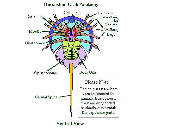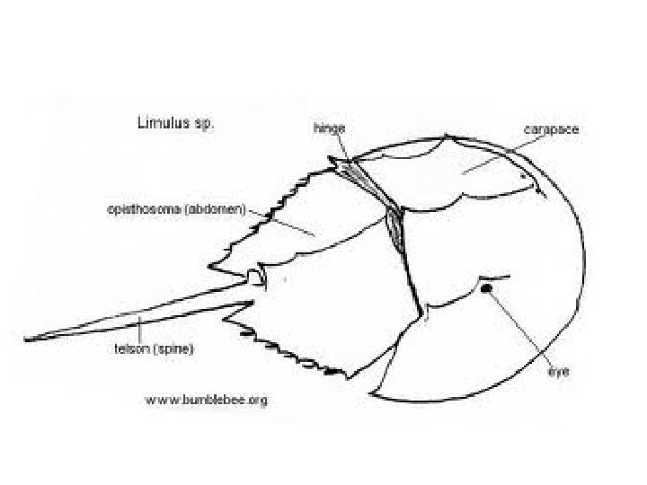 Structure • The whole body of the animal is covered, and protected by two dorsal plates called a carapace. The carapace is said to bear two simple eyes • Beneath the horseshoe shaped part of the carapace is the cephalothorax which bears the animals walking and feeding legs