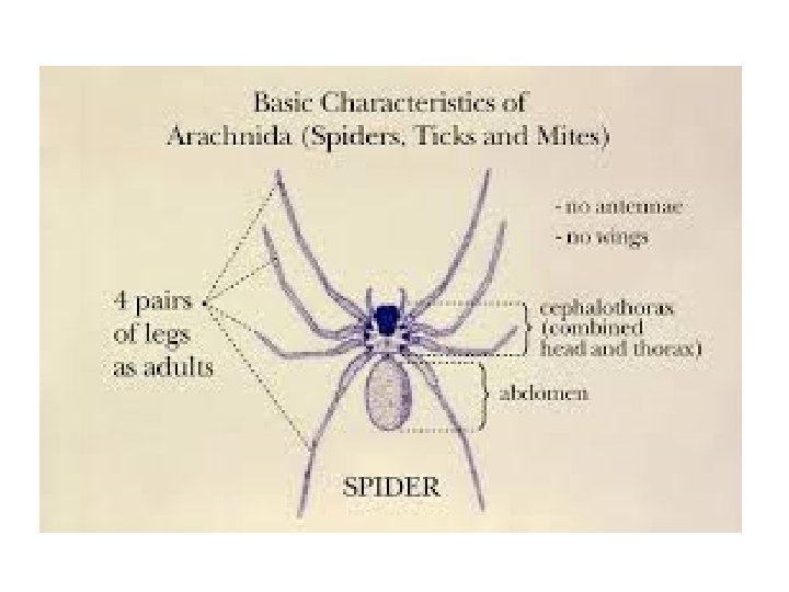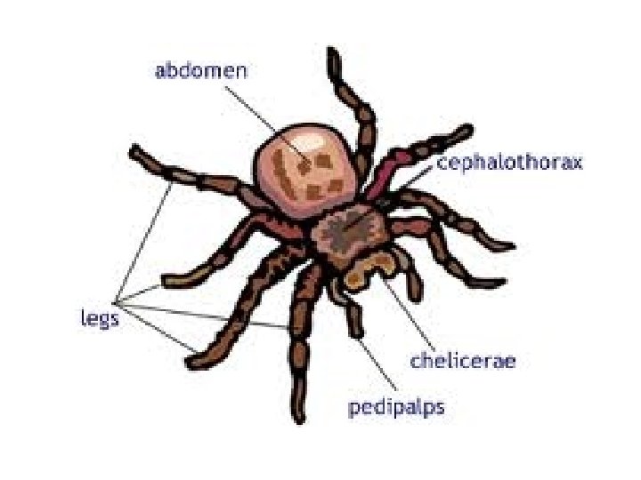 Body plan • All adult arachnids have 8 legs • two further appendages are the chelicerae (for feeding or defense), and the pedipalps (for feeding, locomotion, and/or reproduction) • Their body is organized into two tagmata called the prosoma or cephalothorax , and the opisthosoma or abdomen