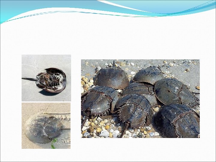 Class Merostomata “Middle stomach” - Horseshoe Crab Atlantic Ocean & Gulf of Mexico Horseshoe shaped carapace (exoskeleton-back) 5 pairs of legs Shallow water Collected off coast of Maine for chemical in blood that makes an antibacterial agent