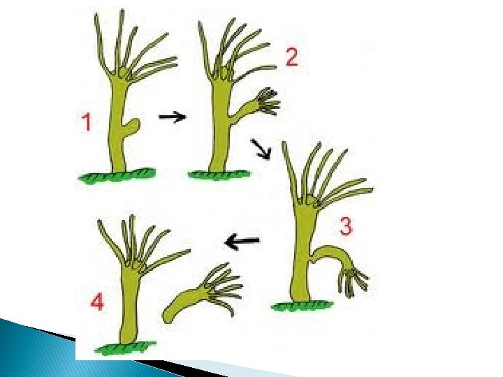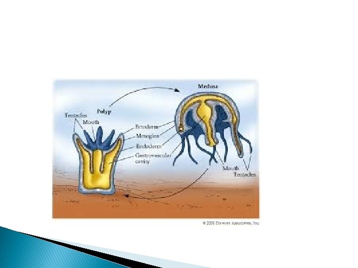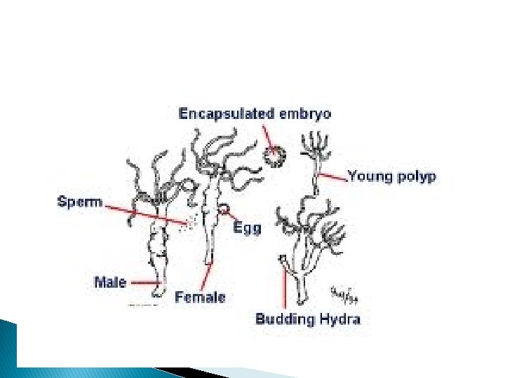 Asexual � After a growth interval, the polyp begins reproducing asexually by budding. � Budding sites vary by species; from the tentacle bulbs, the manubrium (above the mouth), or the gonads of hydromedusae