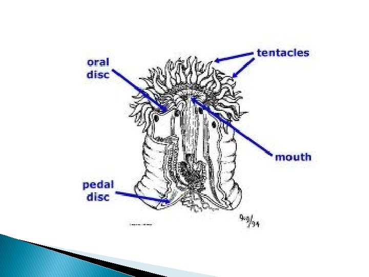 � polyp attached at the bottom to the surface beneath it by an adhesive foot, called a basal disc, with a column-shaped body ending in an oral disc. � Most are from 1. 8 to 3 centimeters in diameter, but anemones as small as 4 millimeters or as large as nearly 2 meters are known. � They can have anywhere from a few tens to a few hundred tentacles
