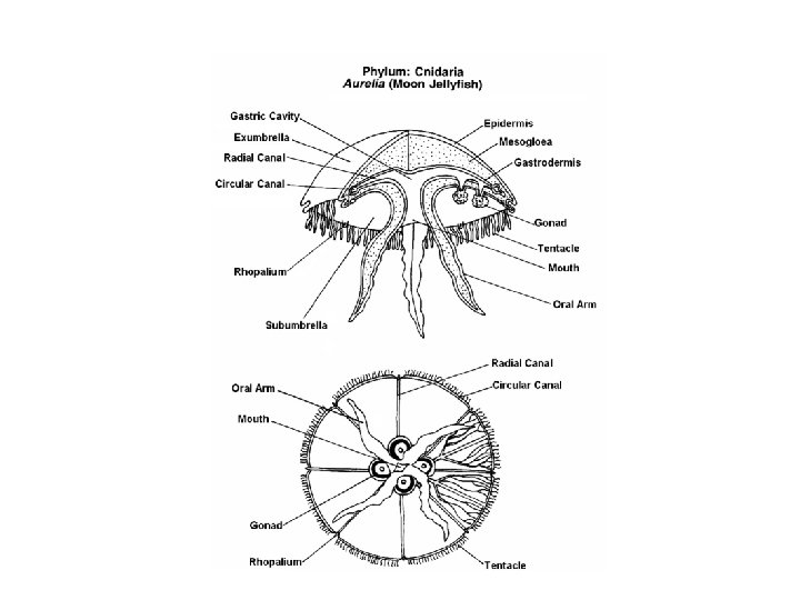 Body Plan • No segments: oral and aboral sides • Hydrostatic Skeleton: fill body cavity with water to remain upright. • Shrink down as defense • Organized at tissue level. (No true organs) • Epidermis: outer cells (ectoderm) • Gastrodermis: lines stomach (endoderm) • Mesoglea: middle layer of gelatinous material; can be thick or thin.