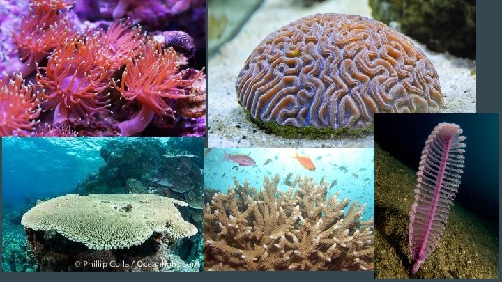 Class Anthozoa (sea anemones, true corals) -benthic -live their lives almost exclusively as polyps -they still have tentacles and nematocysts -many of them (corals) have symbiotic dinoflagellates (Symbiodinium) Need to stay in shallow waters -corals have a Ca. Co 3 skeleton and grow from 0. 5 to 2 cm a year!
