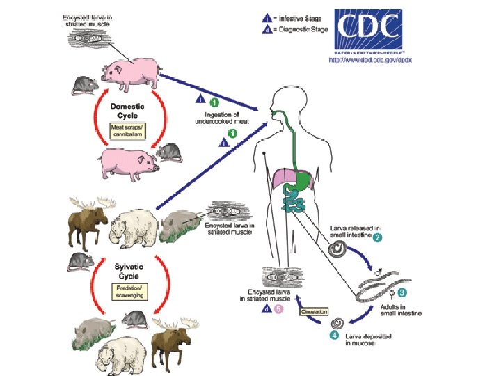 Life cycle of trichinella 1) After exposure to gastric acid and pepsin, the larvae are released from the cysts and invade the small intestine where they develop into adult worms. 2) The life span in the small bowel is about four weeks. 3) After 1 week, the females release larvae that migrate to striated muscles where they encyst (form a cacoon-like structure) Diagnosis: Based on clinical symptoms, and is confirmed by serology (blood analysis) or identification of encysted or non-encysted larvae in biopsy or autopsy specimens.