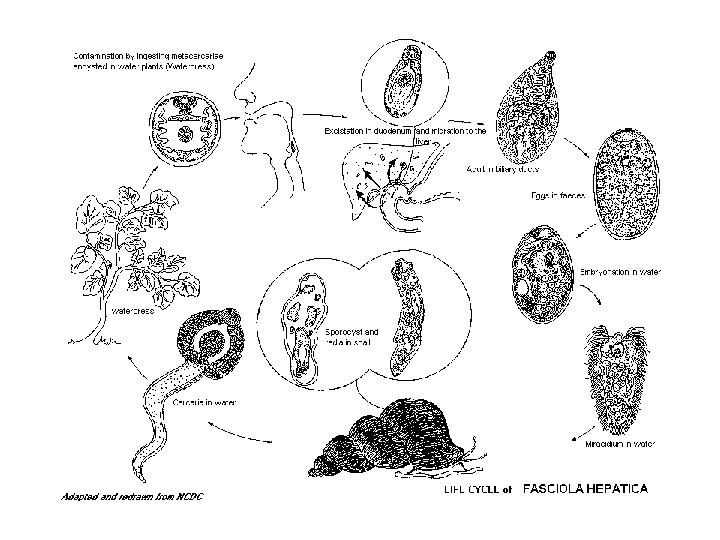 Fasciola hepatica • Cercariae leave snail, encyst on vegetation, and form metacercaria. • Herbivore infected when it ingests vegetation with metacercaria. • Metacercaria develop into adult penetrates gut wall, moves to the liver. • Humans infected by eating watercress that has metacercaria on it.