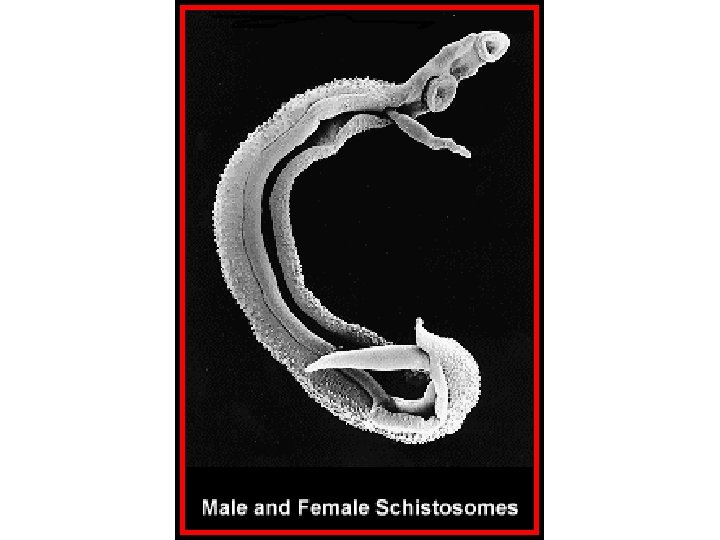 Schistosoma sp. • Adult worms are found in blood vessels of digestive tract or urinary bladder thus called blood flukes • male worm has a split body called the gynecophoral canal. The female is usually found within this canal “safe in the arms of her lover. ” She leaves only during the egg laying period.