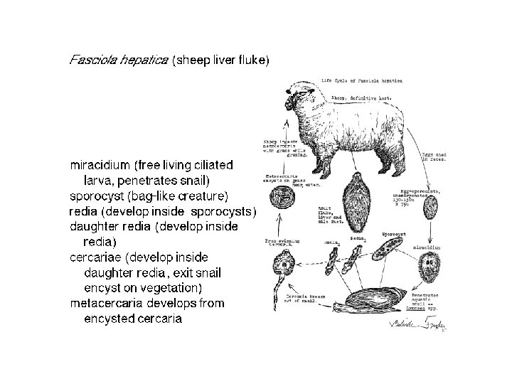 Fasciola hepatica • Adult in bile duct of definitive host passes eggs in feces. • If eggs land in water, they hatch into miracidium that actively swims until it finds an appropriate snail. • Penetrates snail, develops into germinal sac (sporocyst), asexual stages of rediae and cercariae formed.