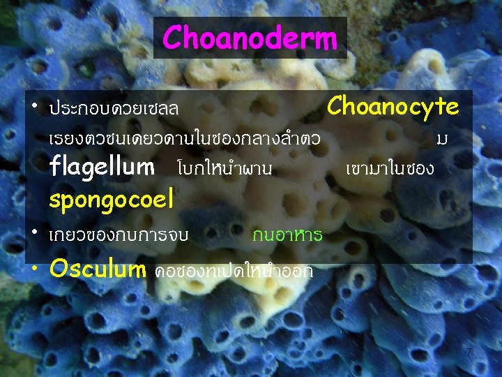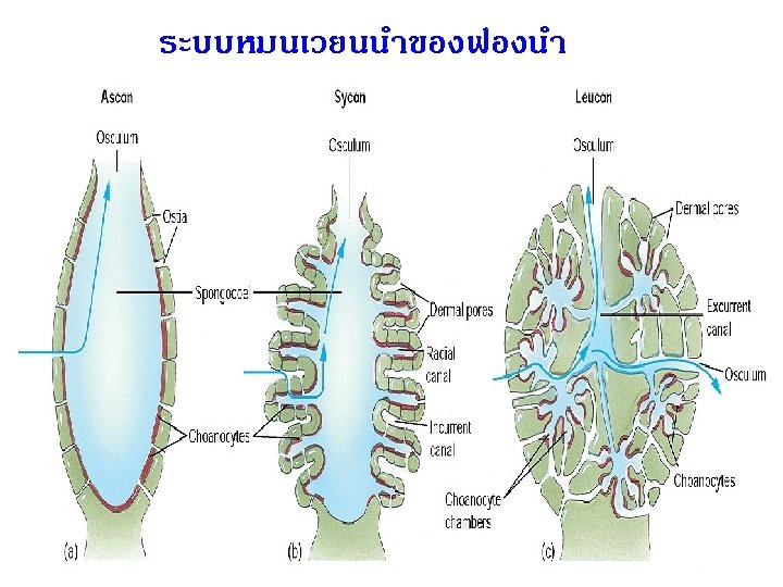 Phylum Porifera 4 6 8 9 Radial canal Slides: 37 Download presentation Phylum Porifera อ. แนต 4 6 8 9 Radial canal choanocyte Scypha sp. 10 12 14 Asconoid Sponge Osculum Leucosolenia sp. Spongocoel Ostium Porocyte Ostium Spongocoel Osculum Syconoid Sponge Scypha (x. s. ) Spongocoel Pinacocyte Apopyle Incurrent Canal Prosopyle Radial Chamber Choanocyte 17 18 Radial canal Radial chamber Choanocyte canal Choanocyte chamber Flagellated canal 19 Flagellated chamber Leuconoid Sponge Apopyle Prosopyle Dermal pore Osculum Excurrent canal Incurrent canal Radial canal 20 สรปแผนผงการหมนเว ยนนำ 1. Asconoid type ostium spongocoel 2. Syconoid type dermal pore incurrent canal (Grantia) osculum prosopyle osculum radial canal spongocoel 3. Leuconoid type dermal pore osculum incurr. canal prosopyle excurrent canal apopyle radial canal apopyle 21 Asexual Reproduction • • • Budding Fragmentation Gemmule formation -survive freezing Micropyle Spicule 22 Gemmule 24 26 Grantia sp. 27 Grantia sp. 28 Class Calcispongiae • มขนาดเลก สวนใหญรปรางกระสวย • Calcium carbonate spicule -monaxon และ triaxons 29 Leucosolenia sp. Scypha sp. Grantia sp. Leucosolenia sp. 31 Monaxon and triaxon spicules 32 Class Hyalospongiae Euplectella • Silica spicule ม 6 แฉก • ไมมชน pinacoderm และ mesohyl • ระบบไหลเวยนนำคลาย syconoid type • อาศยในทะเลลก 33 Class Sclerospongiae Sclerospongia sp. • เกาะอยบนกอนปะการง • Silica spicule และ spongin โดยม Ca. CO 3 อยทฐาน 35