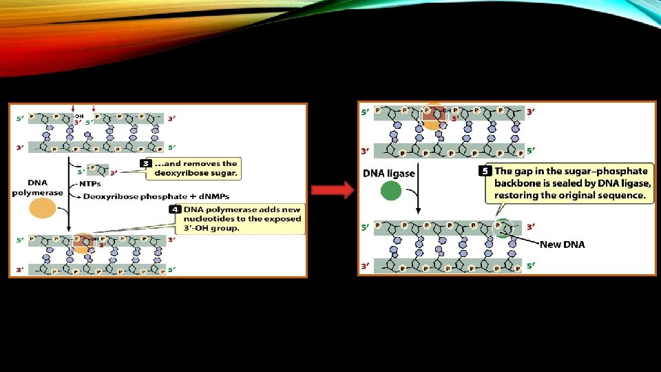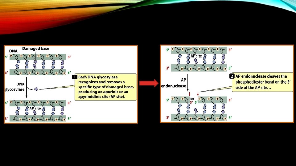 DNA MUTATIONS AND REPAIR • When such breaks occur, DNA usually repairs itself through a process called excision. The base-excision process has four steps: 1. DNA glycosylase removes the damaged base. 2. AP endonuclease cleaves the DNA backbone and removes the deoxyribose sugar and the phosphate group. 3. DNA polymerase adds new nucleotides in the gap. 4. The gap is sealed by DNA ligase.