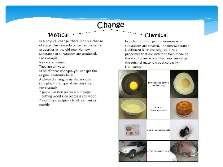 Physical and Chemical Changes Physical Change- Affects the physical appearance of matter but NOT is composition (it remains the same substance. Most physical changes are easily reversible e. g. Ice melting, Kool-Aid dissolving, Cutting paper Chemical Change- Alter the composition of a substance (substance is changed to a new substance) e. g. Burning firewood, baking a cake