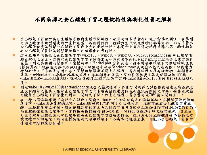Physical and tabletting characterization of chitosan obtained from various sources n n Chitosan is a biodegradable and biocompatible biopolymer leading to draw many research’s interests. It has been investigated as an excipient in the pharmaceutical field to be used in direct compression, as a disintegrant for the improvement of drug dissolution, as a matrix material for the production of controlled release solid dosage forms. The physical properties of chitosan is mainly characterized by two parameters: degree of acetylation and molecular weight. In this study, the possible use of chitosan from two different sources with variation in these two parameters as directly compressible excipient for modification of drug release were examined. Five different chitosan products (wako 10, wako 100, wako 500, and 903 from shell chitin, and sacchachitosan from sacchachitin) varied in physical properties were selected for evaluation of main factors influencing the success of direct compression. Powder only and a series ratio of binary mixture with acetaminophen were prepared for characterization with the measurement of powder rheology, compaction profiles, heckel plot analysis, and drug dissolution in three different conditions (simulated gastric fluid, p. H-changing medium, and simulated intestinal fluid). Preliminary results demonstrated that the compressibility of sacchachitosan was so poor to form tablet even increasing compression force to a higher value. Compaction profiles showed that there was insignificant difference in profiling parameters including effective work and ejection force for all chitosan products compared. Yield pressure calculated from Heckel plot for each product also demonstrated to be insignificantly different. However, the tensile strength of tablets prepared with wako 100 and wako 10 was much higher than that with wako 500 and 903. Degree of elastic recovery might be used to explain why wako 100 and wako 10 could make tablets stronger. The compressibility for a series of binary mixture of acetaminophen and chitosan of wako 100 and wako 10 were determined. There also shows insignificant difference in degree of elastic recovery and effective work. With increasing the percentage of chitosan in the formulation, the ejection force of tablets decreased and the tensile strength of tablets increased correspondingly. The yield pressure of tablets decreased with increasing percentage up to 70% of chitosan in tablet formulation as well for all types of chitosan examined, and then increased afterward with increasing the percentage of chitosan. The drug release of acetaminophen from binary mixture of acetaminophen and wako 100 (or wako 10) was examined in three different media. The drug release follows a sustained manner in simulated gastric fluid (p. H=1. 2) when the percentage of chitosan in tablet formulation is greater than 30% for wako 10 and 10% for wako 100. This is expectedly due to the gelling effect of chitosan in contact with acidic environment. Since that, the higher viscosity of chitosan is used, the less amount of chitosan is needed to achieve the sustained effect. Dissolution under p. H-changing medium, the sustainability of drug release is even extended to be longer than 24 hours after changing to simulated intestinal fluid (p. H=6. 8). This might be ascribed to the insolubility of chitosan in neutral p. H leading to the formation on the tablet surface of gel barrier with higher resistance than that formed in acidic medium. However, the dissolution of these tablets in the simulated intestinal fluid was faster as a result of disintegration effect of chitosan. This disintegration effect of chitosan might be explainable by its insolubility in neutral medium.