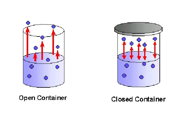 CLOSED CONTAINER: 1. As more molecules become vapour, the more molecules collide with surface and condense. 2. As evaporation increases - condensation increases until there is a balance. Balance is (dynamic) equilibrium liquid-vapour equilibrium