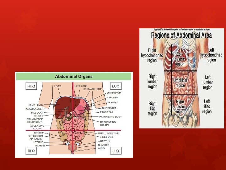 Abdomen/GI system Inspect for contour, splinting, symmetry Auscultate all four quadrants listen up to 5 minutes if bowel sounds not heard gurgling or clicking sounds normal “silent belly” uncommon Palpate for tenderness, masses, organomegaly, organ borders Enquire about last BM