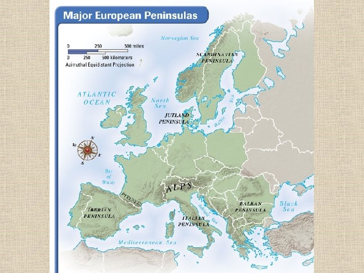 A Peninsula of Peninsulas � � � Europe is part of the large landmass Eurasia Scandinavian – Norway and Sweden Jutland – Denmark Iberian – Spain and Portugal Balkan – Greece Italian – Italy