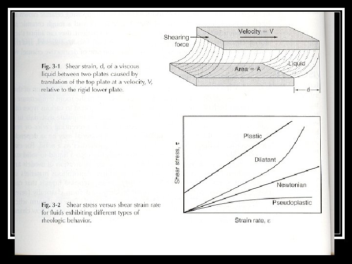 A liquid occupies space between 2 metals plates; the lower plate is fixed and upper plate is moved right at a velocity (V). A force (F) is required to overcome the frictional resistance to the fluid flow. If the plates have an area (A) in contact with the liquid, a Shear stress ( ) ז can be defined as = ז F/A. The shear strain rate or the rate of change of deformation, is έ=V/d, where d is the shear distance of top plate relative to the fixed lower plate.