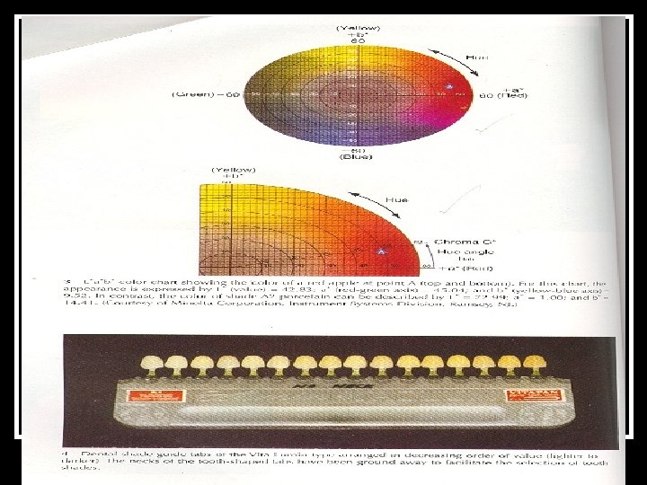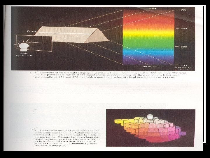 Light from an object that is incident on an eye is focused on the retina and is converted into a nerve impulse that are transmitted to the brain. Cone shaped cells in the retina are responsible for colour vision. Eye is most sensitive to the light in the green yellow region and least sensitive at either extreme i. e red or blue. Measurement of colour One of the most commonly used method to define and measure colourquantitatively is the Munsell System. It is a co ordinate system which can be viewed as a cylinder. The lines are arranged sequentially around the perimeter of the cylinder, while the chroma increases along a radius from the axis. The value coordinate varies along the length of the cylinder from black at the bottom to neutral grey at the center to white at the top.
