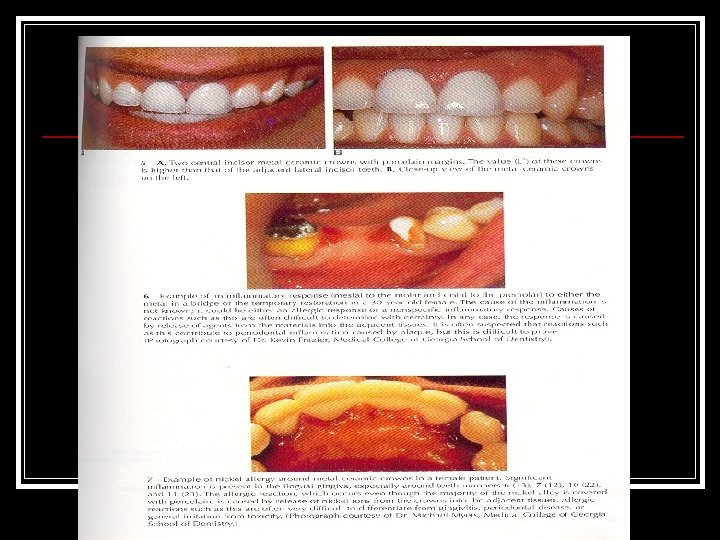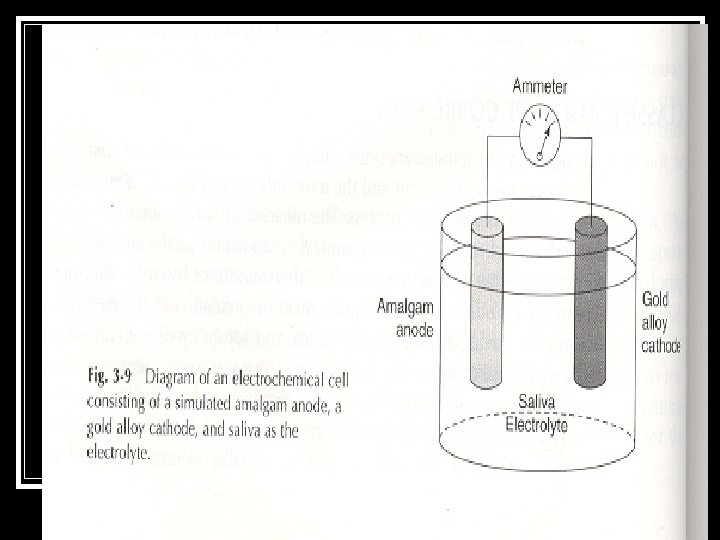 n (1) Galvanic' Corrosion or Dissimilar Metal Corrosion n Galvanism is the generation of electrical current that the patient can feel, which results when two dissimilar metals are in direct physical contact. Metals placed in an electrolyte have various tendencies to go into solution. Aluminum, alloys of which are sometimes used as temporary crowns has an electrode potential of + 1. 66 volts. Gold, has an electrode potential of - 1. 49 volts. These fillings in conjuction with saliva or oral fluids function as the electrolyte, acts similar to that of an electrical cell. When the two restorations comes in contact with each other, current flows because they are placed at different positions in electromotive series. If the flow of current occurs through the pulp, the patient experiences pain also known as galvanic pain and frequently complains of a metallic taste. Here, . the more anodic restoration may corrode. Gold alloy crown