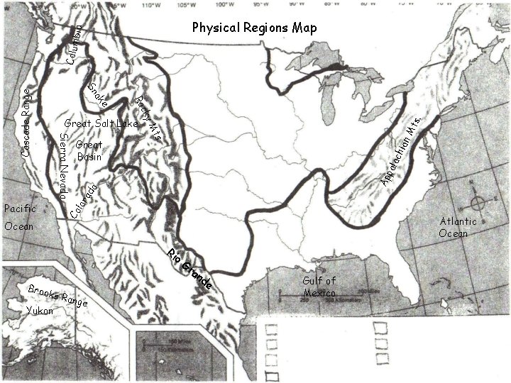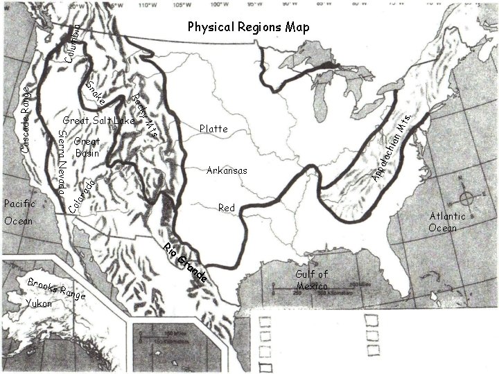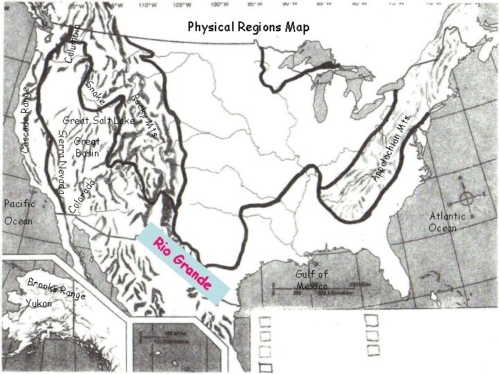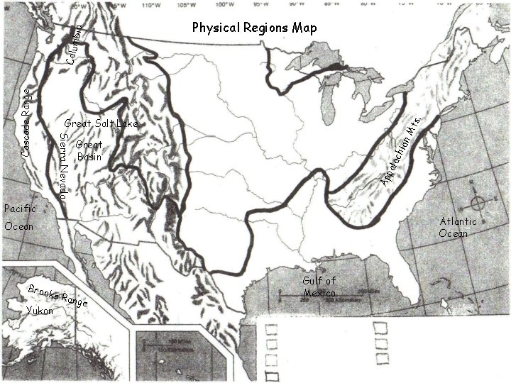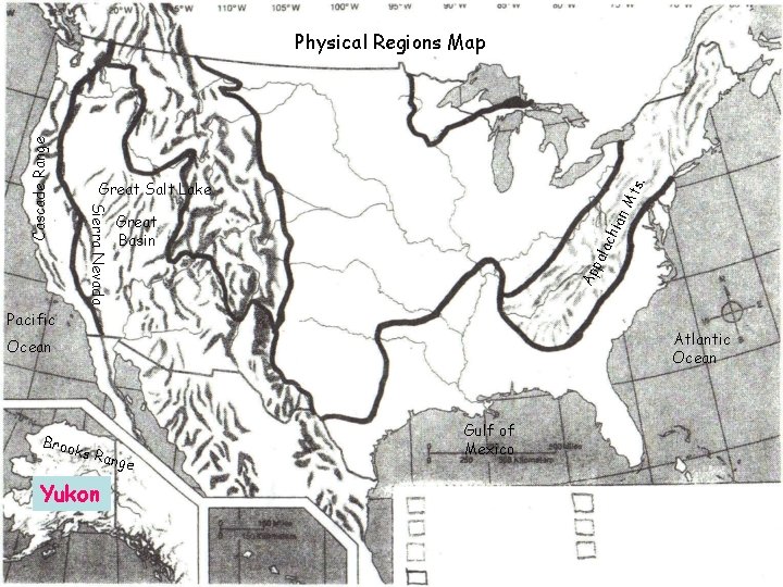 Cascade Range Physical Regions Map pal ach i Great Basin Ap Sierra Nevada an M ts. Great Salt Lake Pacific Atlantic Ocean Broo ks R ange Yukon Gulf of Mexico
