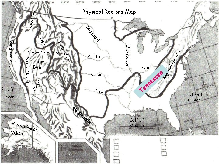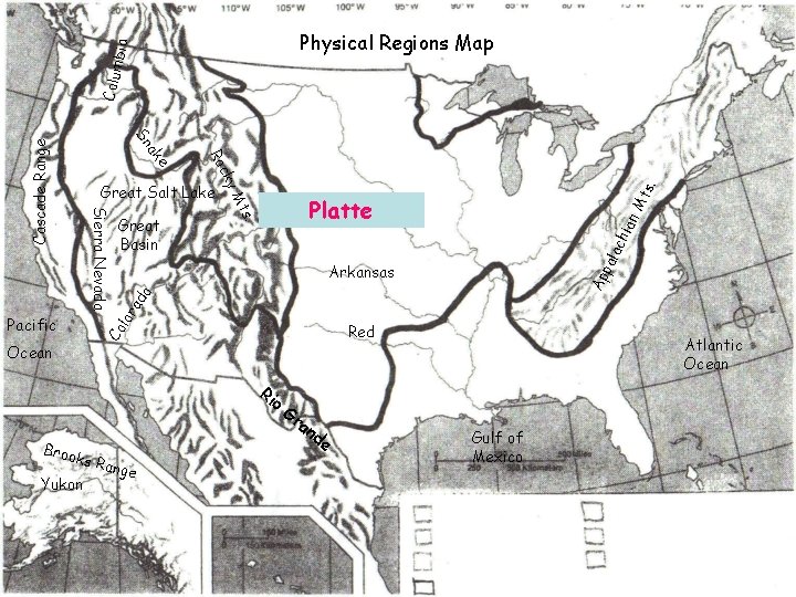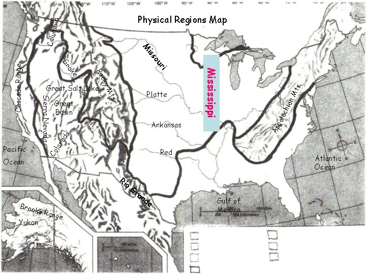 Co lor ts. an M Red Ri Broo pal ach i ad o Arkansas Ohio Ap s. Mt Great Basin Platte Mississippi cky Cascade Range ri Ro e ak Sn Ocean Great Salt Lake Sierra Nevada Pacific ou iss M Colum bia Physical Regions Map ks R ange Yukon o Gr an de Atlantic Ocean Gulf of Mexico