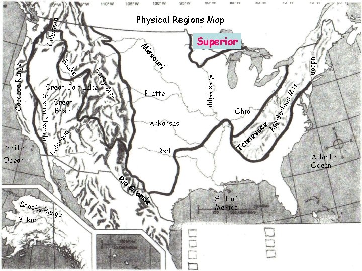 Superior Red ks R ange Yukon o Gr an de Gulf of Mexico e pal ach i an M o Co lor ad nn e T ee s s Ap Mississippi s. Mt Ohio Arkansas Ri Broo Platte ts. ri cky Cascade Range ou Ro e ak Sn Ocean Sierra Nevada Pacific Great Salt Lake Great Basin Hudson iss M Colum bia Physical Regions Map Atlantic Ocean