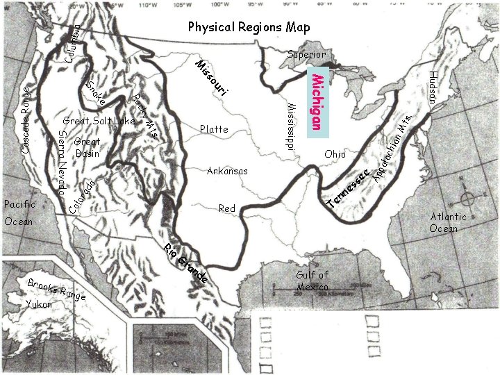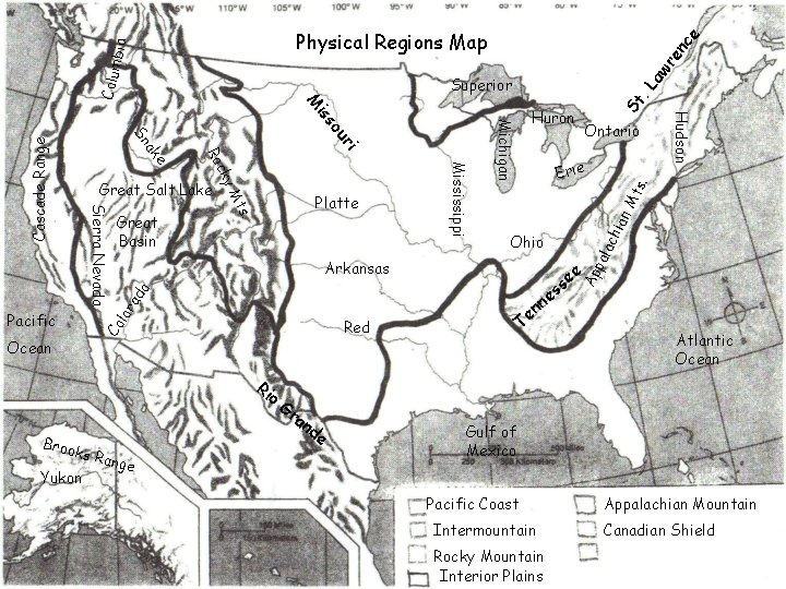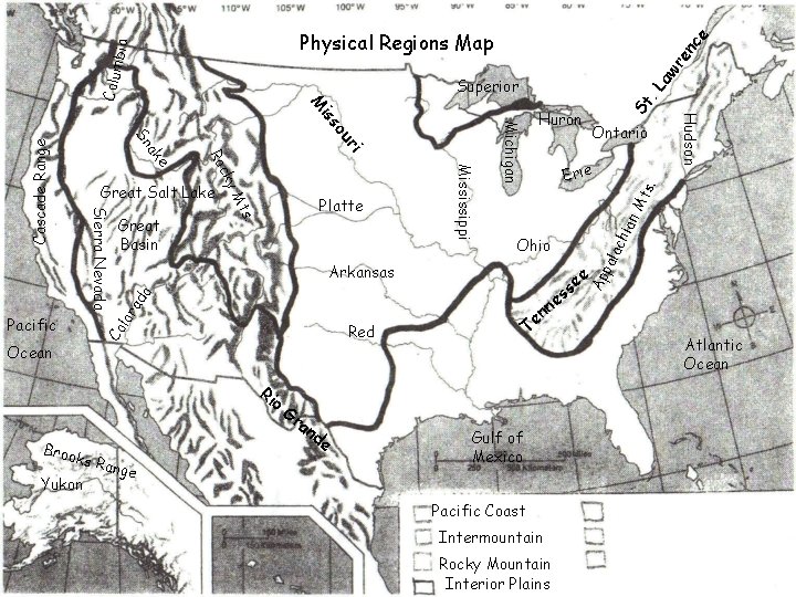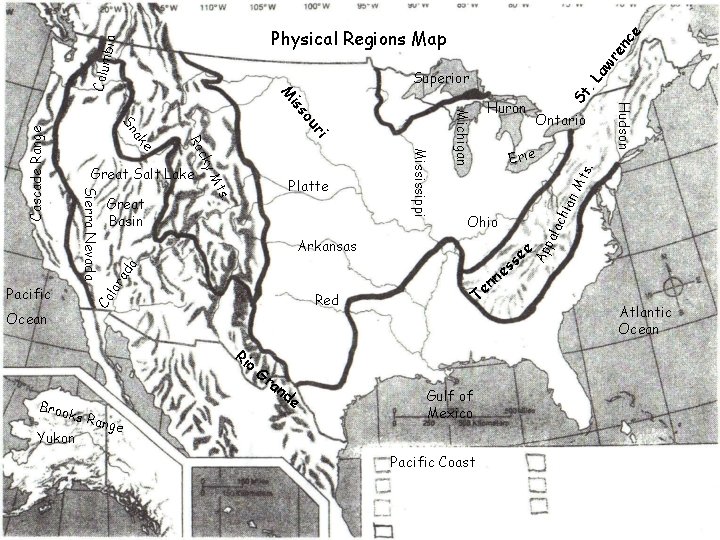 ks R ange Yukon Gr an de e re nc Gulf of Mexico Pacific Coast Intermountain Rocky Mountain e St ts. pal ach i an M o Co lor ad nn e T ee s s Ap Mississippi s. Mt Cascade Range ri cky Erie Ohio Red o Ontario Hudson Huron Arkansas Ri Broo Michigan ou iss M Ro e ak Sn Ocean Great Basin Platte . L Superior Great Salt Lake Sierra Nevada Pacific aw Colum bia Physical Regions Map Atlantic Ocean
