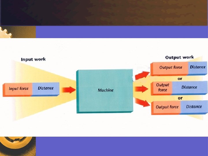 Work u Work Input (Win) l work done on a machine Win = Fe × de u Work Output (Wout) l work done by a machine Wout = Fr × dr