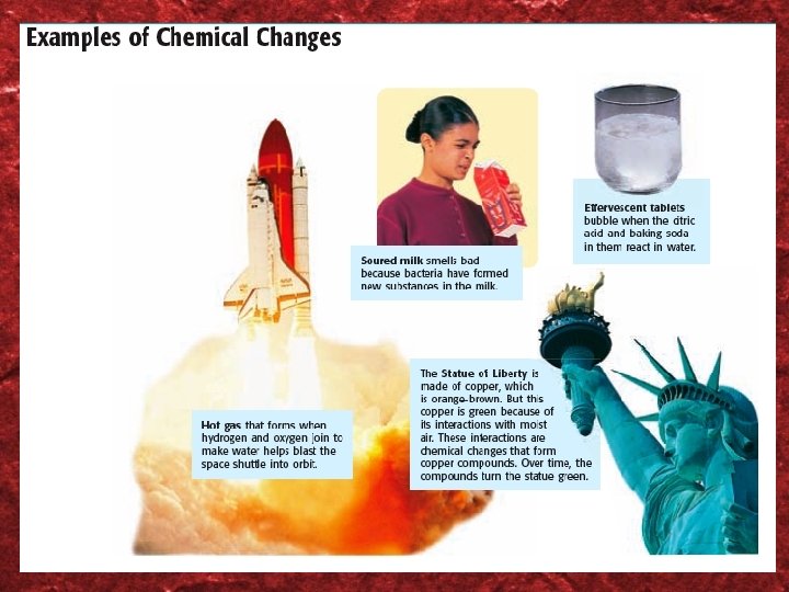 QUIZ: Physical or Chemical change? 1. A piece of paper gets wet? physical 2. Two chemicals are mixed & a purple gas appears? chemical 3. You add green food coloring to a pancake batter? physical 4. Water freezes and becomes ice? physical 5. Batter placed in oven makes a cake? chemical