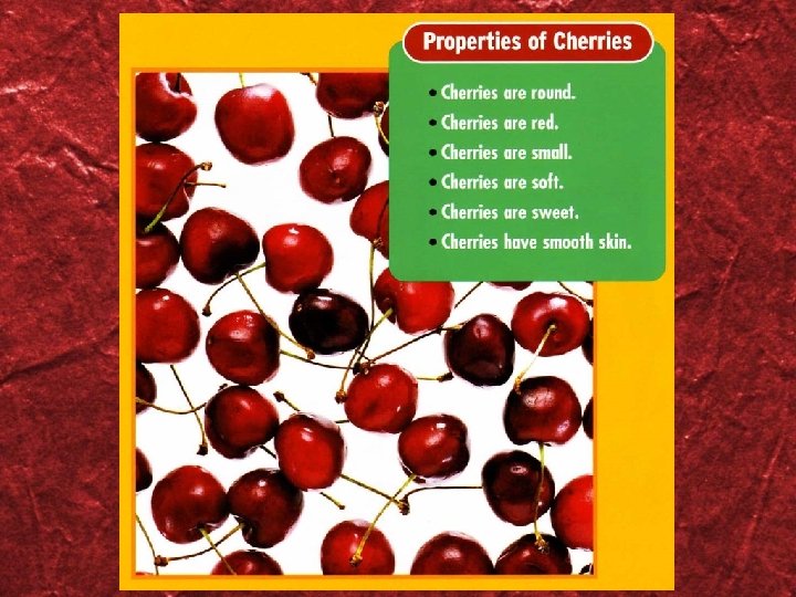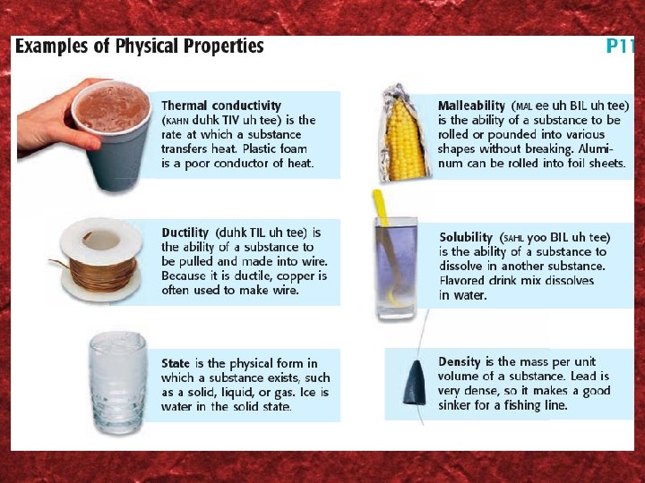 PHYSICAL PROPERTY - A PROPERTY is the same as a characteristic. - Anything that you can see from direct observation. - The Physical Property of a substance includes: - Shape - Size - Color - Texture - Density