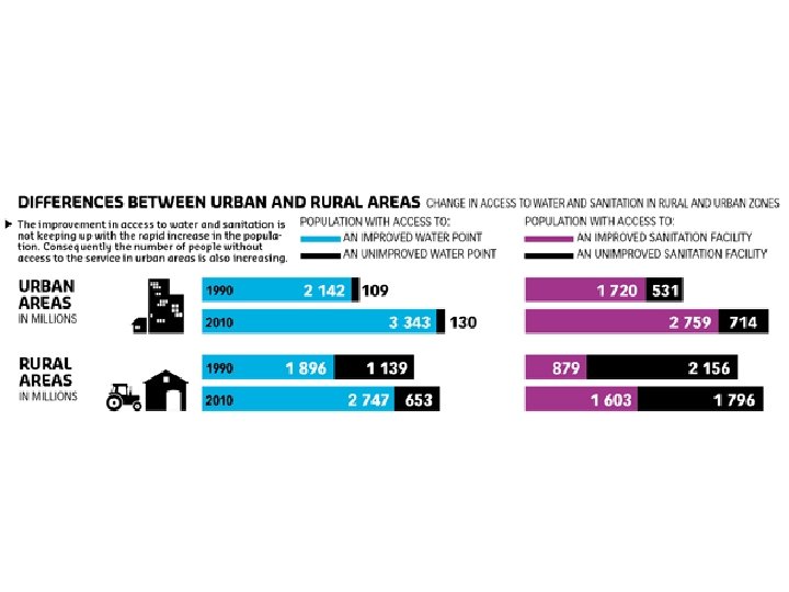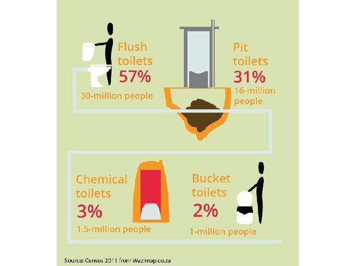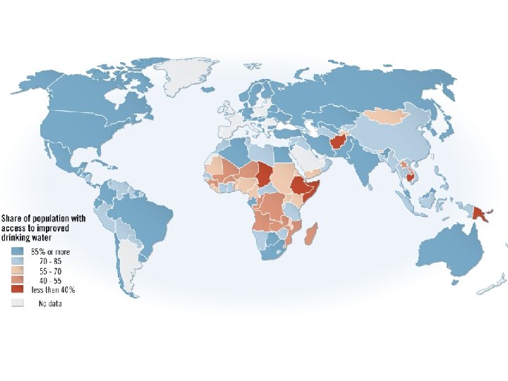 • 1 in ten people don’t have access to safe water • 1 in three people don’t have access to a toilet