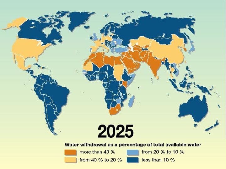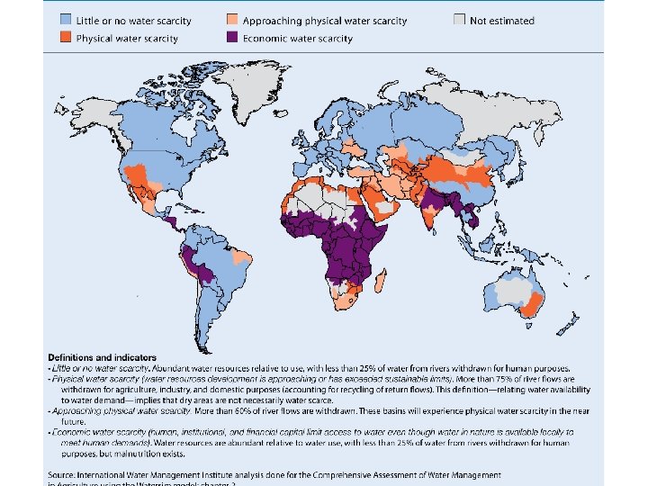 Physical Water Scarcity • “physical water scarcity, where water resource development is approaching or has exceeded unsustainable levels; it relates water availability to water demand implies that arid areas are not necessarily water scarce. ” IBO • Physical access to water is limited • Demand outstrips supply • For the most part, dry parts of the world or arid regions are most often associated with physical scarcity • Increasingly a man-made condition • The Colorado river basin in the United States